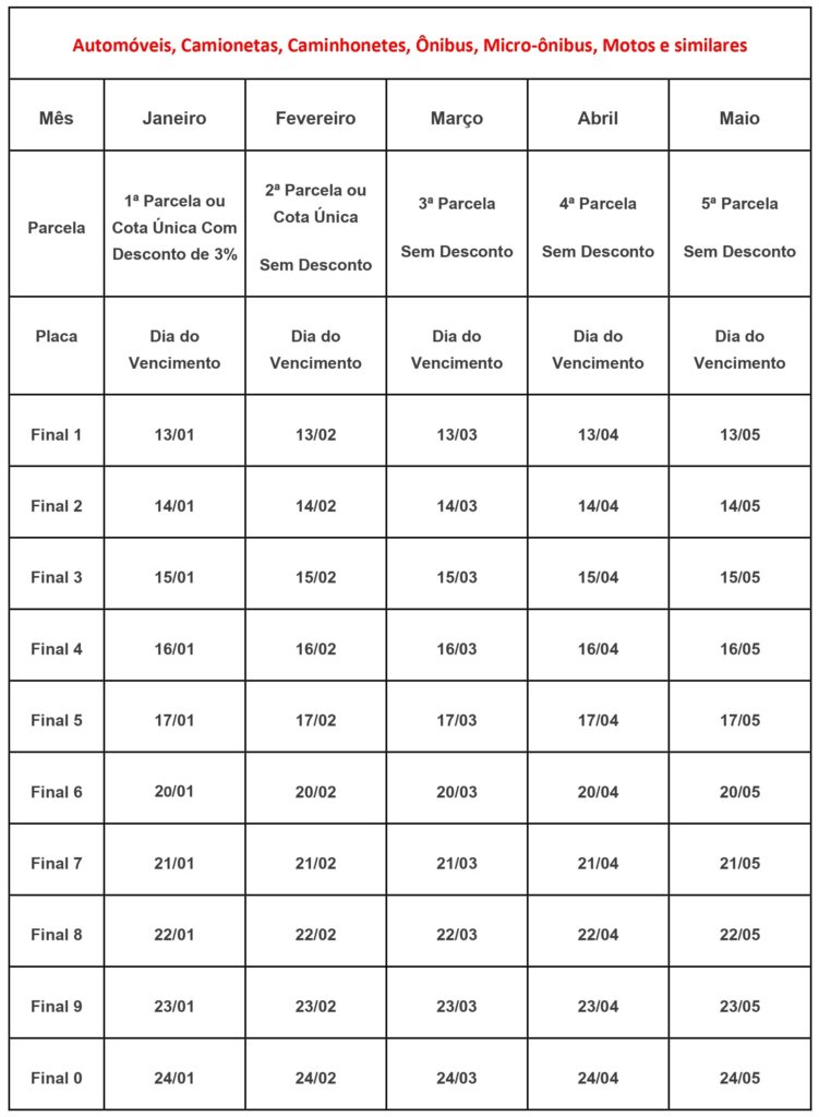 Os proprietários poderão escolher entre as seguintes formas de pagamento com vencimento de acordo com o final da placa:
