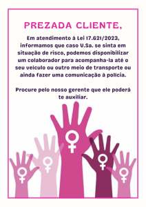 No dia 3 de fevereiro, o governador de São Paulo, sancionou a Lei Nº 17.621/2023, onde os bares, restaurantes, casas noturnas e eventos ficam obrigados a adotar medidas para auxiliar as mulheres que se sintam em situações de risco.